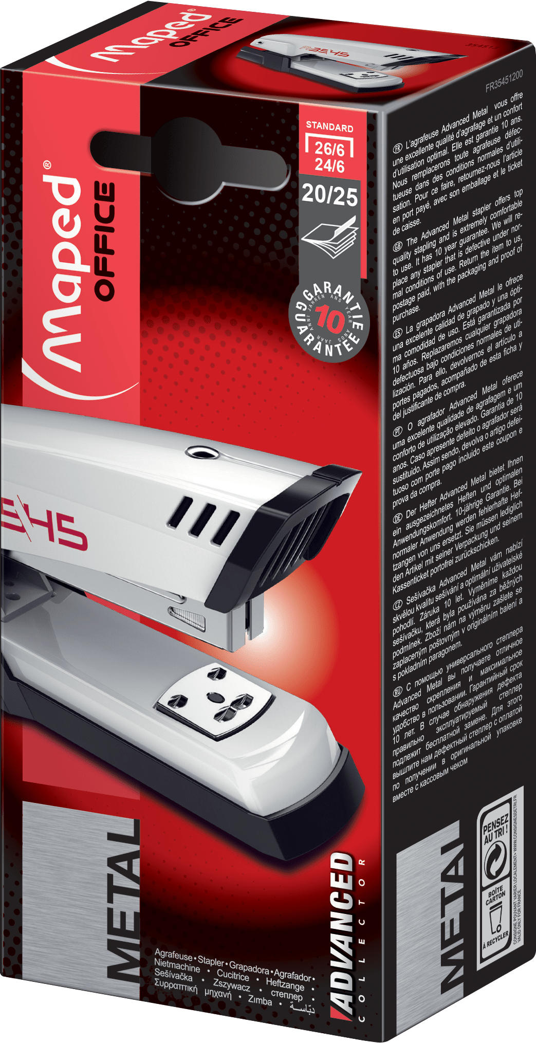 دباسة معدنية عالية الجودة من مجموعة Advanced من Maped. مصممة لراحة الاستخدام وطول العمر، تقوم بتدبيس حتى 25 ورقة باستخدام دبابيس قياسية 24/6 و26/6. مدعومة بـ ضمان 10 سنوات، مما يجعلها خيارًا موثوقًا للمكتب والمدرسة.