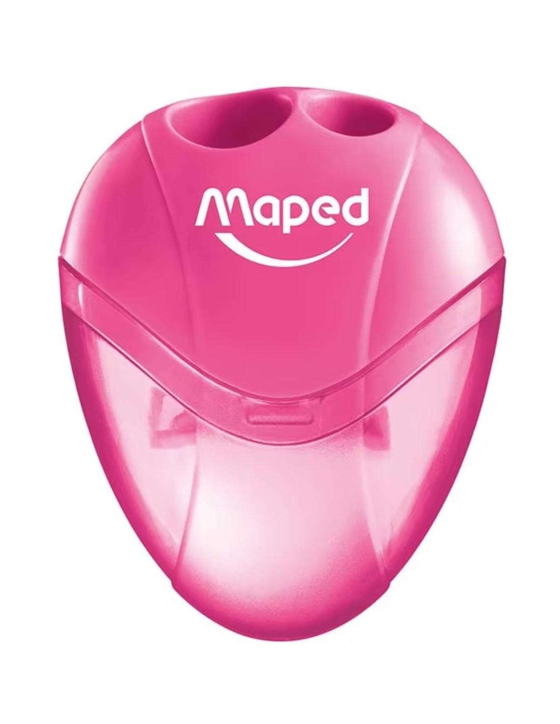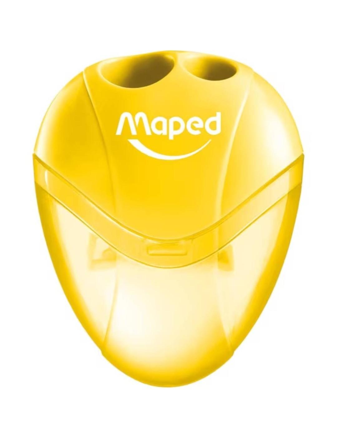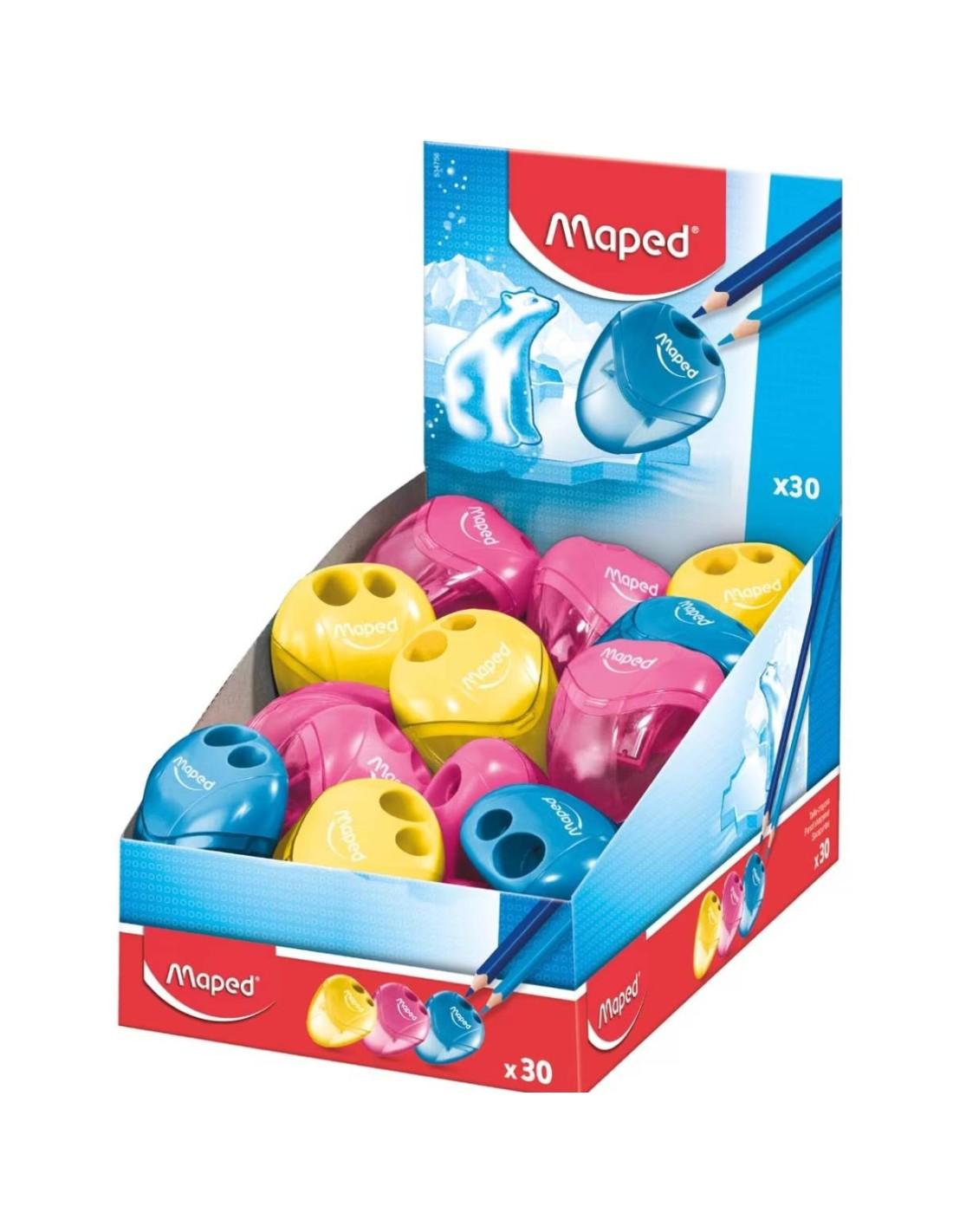 Maped Igloo 2-Hole Pencil Sharpener with container. Features two hole sizes for standard and jumbo pencils. Compact design with a translucent body. Available in blue, yellow, and pink.