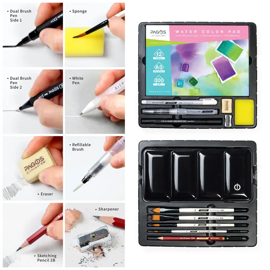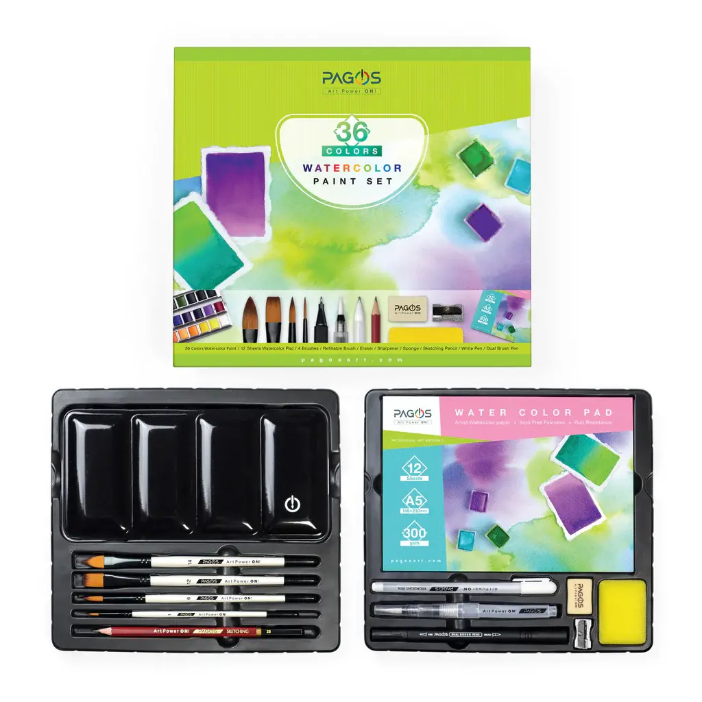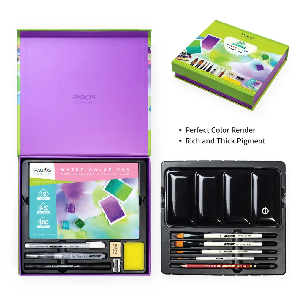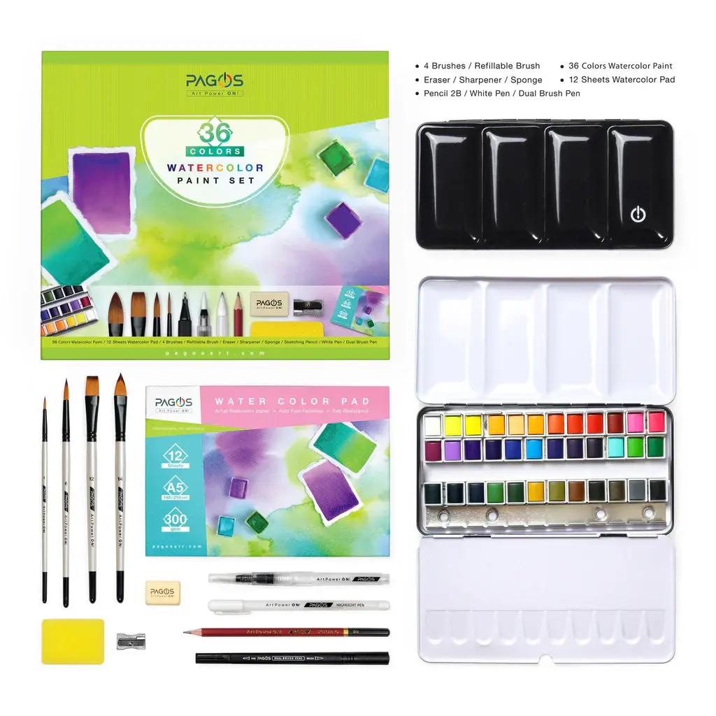 تحتوي المجموعة على 36 لونًا مائيًا، فرش رسم، قلم فرشاة مائي قابل لإعادة التعبئة، دفتر ورق مائي يحتوي على 12 ورقة، وقلم رصاص للرسم والتخطيط. مناسبة للمبتدئين والمحترفين.