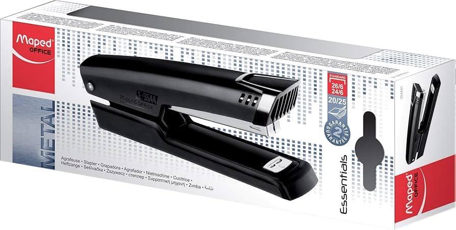 Maped Office Metal Stapler E-3544, heavy-duty stapler for professional office use. Compatible with 24/6 and 26/6 staples, it staples up to 25 sheets at once. The robust metal construction ensures long-lasting durability, with a sleek black design ideal for frequent and intensive use.