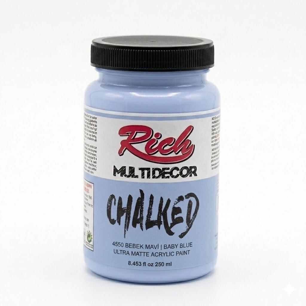 Rich Multi Decor Chalked Paint is a water-based acrylic paint with an ultra-matte, velvety finish. Designed for easy application on multiple surfaces without sanding or priming.